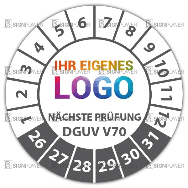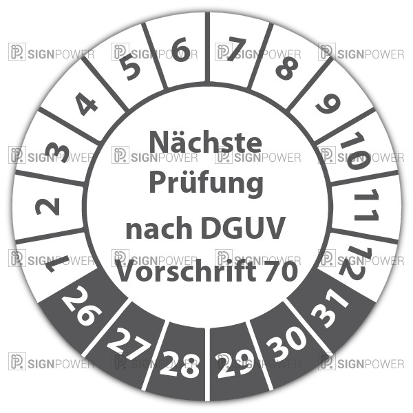 • Prüfplakette Dokumentenfolie "Nächste Prüfung nach DGUV Vorschrift 70" Prüfplakette Dokumentenfolie "Nächste Prüfung nach DGUV Vorschrift 70" logo