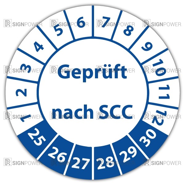 Prüfplakette "Geprüft nach SCC" auf Bogen